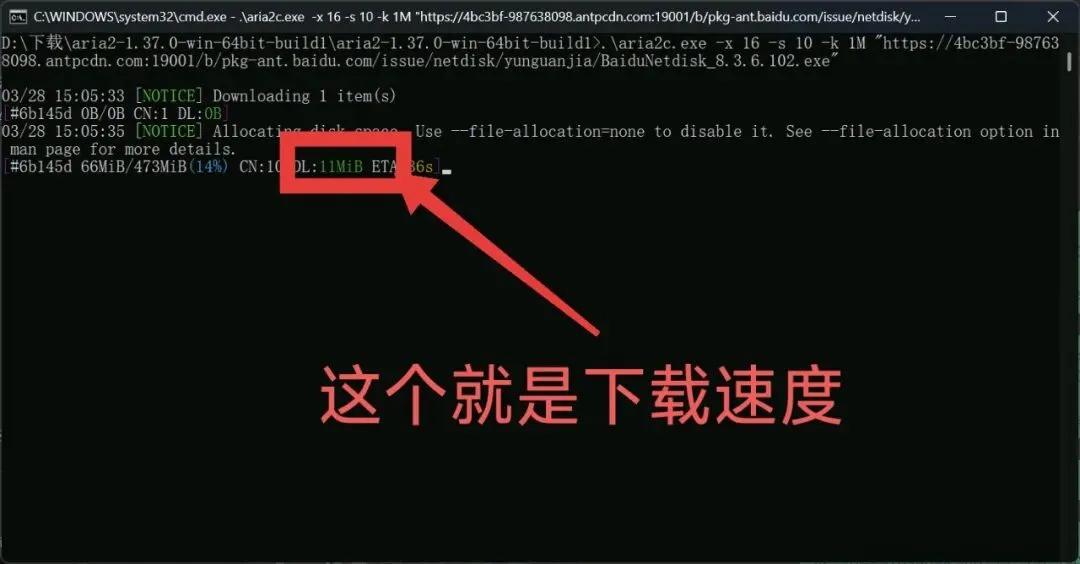 3. 复制百度网盘直链(需配合油猴脚本获取),输入这个命令开始下载:.\aria2c.exe -x 16 -s 10 -k 1M "你的下载链接"