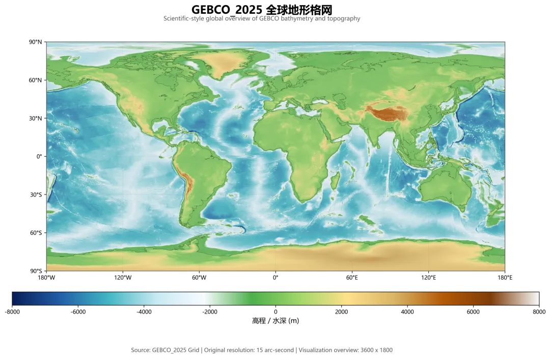 数据集优势:与单纯提供海底地形的区域格网或仅保留海域信息的产品相比,GEBCO_2025 的优势在于同时提供全球海洋、陆地和冰面高程的连续表达,能够支持跨海陆边界的综合分析。与需要用户自行整合多源观测的原始测深资料相比,该数据显著降低了前处理成本和数据拼接难度。