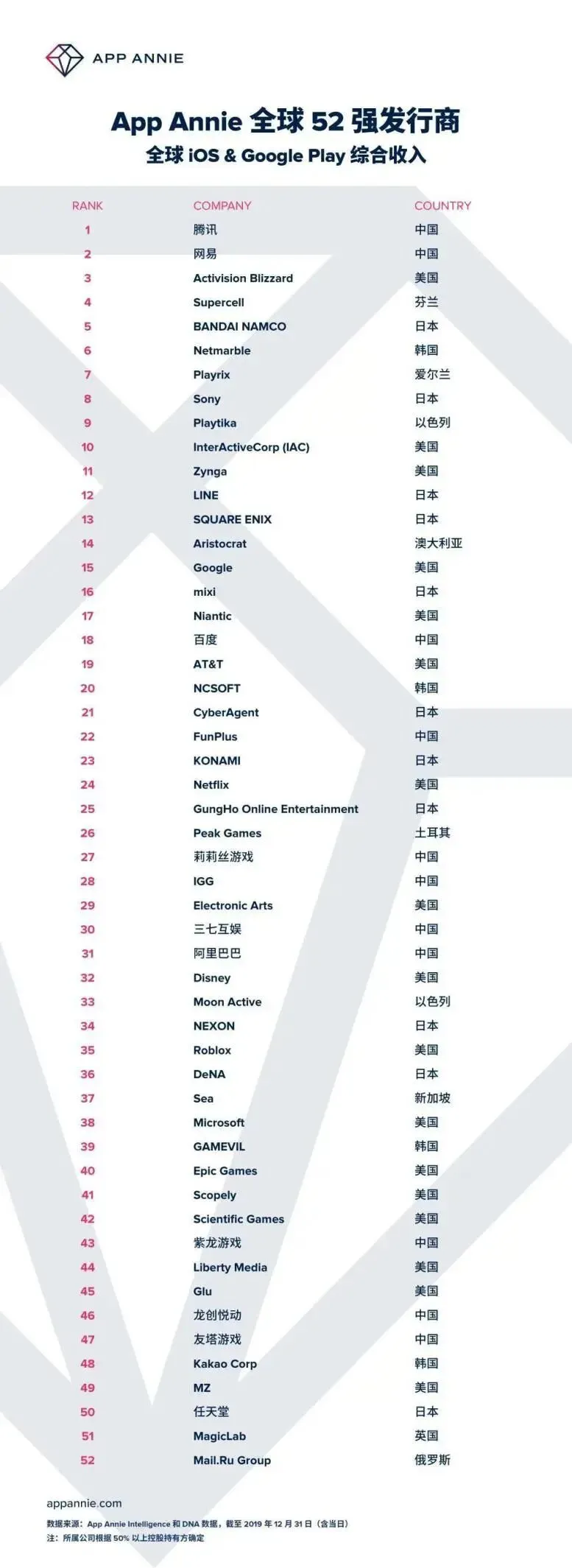 今日,App Annie发布了应用商店(iOS&Google Play)全球发行商2020年TOP52,该排行榜自2012年起,App Annie每年针对该年发行商数据成绩表现得来。