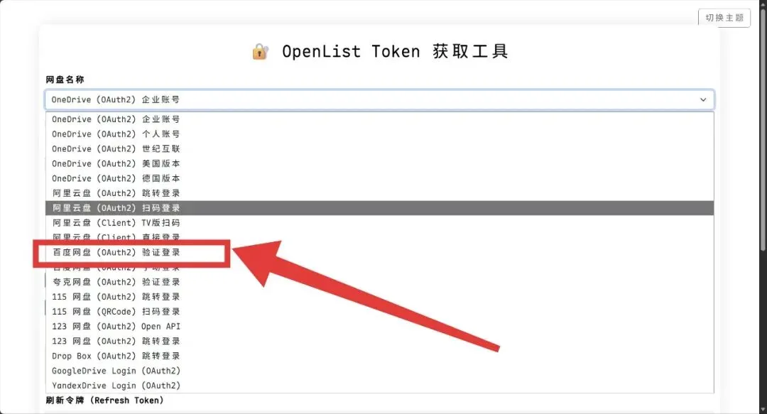 3. 打开OpenList官方Token获取工具,在网盘名称下拉框,选择「百度网盘(OAuth2)验证登录」