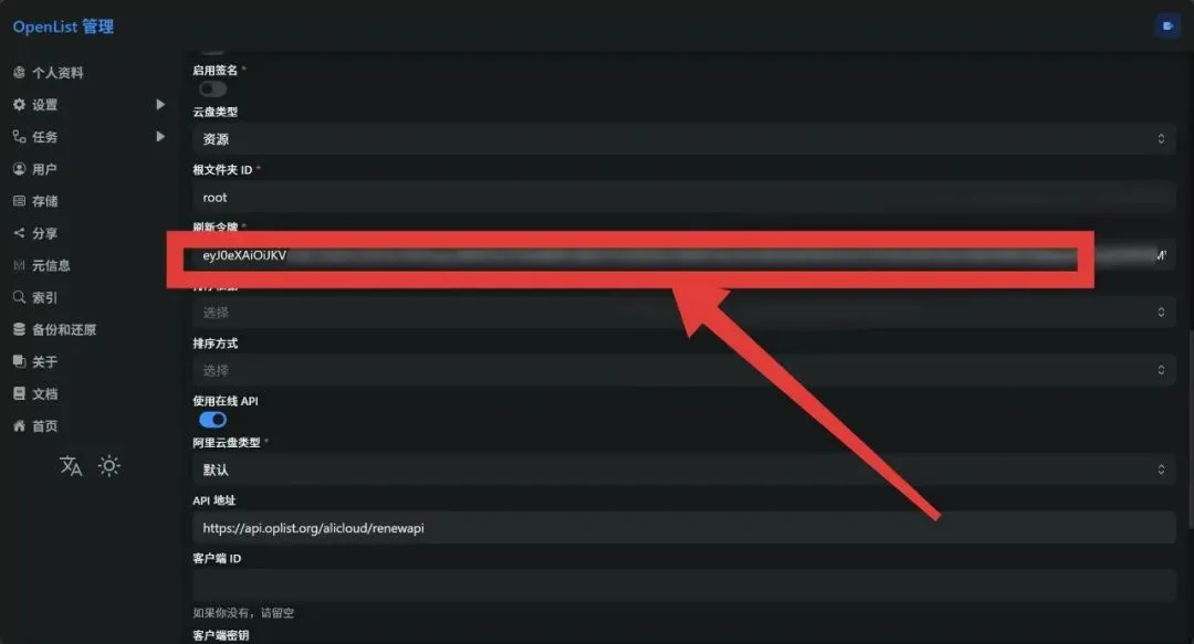7. 回到OpenList添加存储页面,把刷新令牌粘贴到对应输入框,其他默认即可