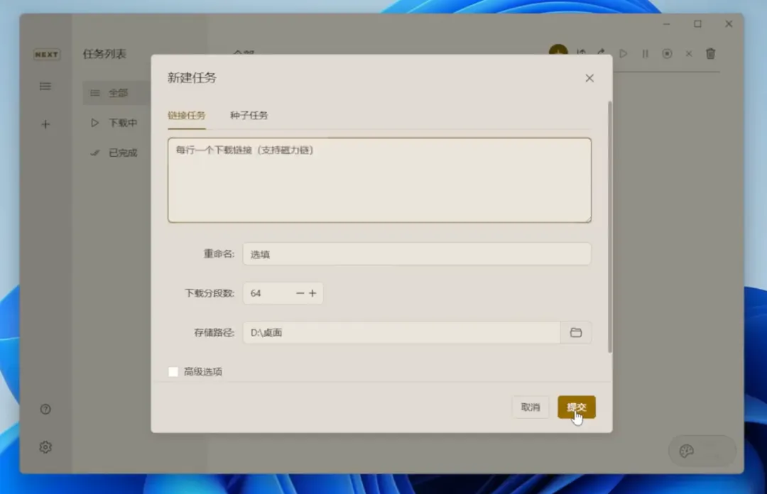 点击左上角的+号,就会弹出一个新建任务列表,把我们的磁力链接或者直链,还是网盘链接输入到任务当中,选择你想要保持的位置,点击提交就可以了。