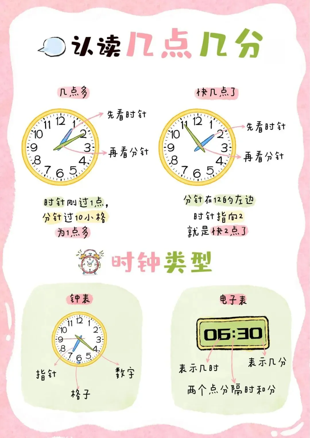 今天分享:幼小衔接数学启蒙知识之认识钟表,包括认识表盘、时间换算、认读整点和半点、认读几点几分、表示时间、推算时间、画时针和分针、感知时间的长短等内容,需要的家长抓紧时间下载打印出来给孩子学一学、练一练吧,欢迎分享给更多需要的人哦……
